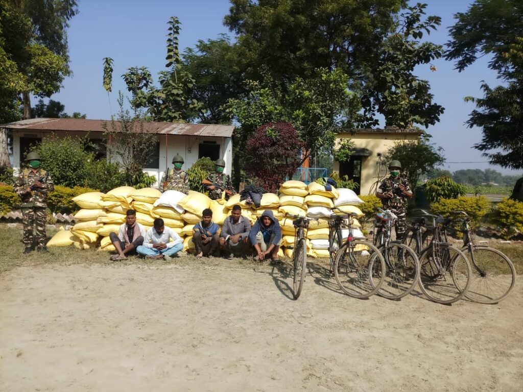 झुलनीपुर एसएसबी के सहायक कमांडेंट संजय प्रसाद ने बताया कि मुखबिर की सूचना पर हमने अपने जवानो के साथ पिलर संख्या 500/5 के रास्ते से नेपाली मटर की खेप जाने वाली है,जिसे गंभीरता से लेते हुए जवानों के साथ नाके पर बैठकर थोड़ी देर इंतजार के बाद नेपाल की तरफ से नेपाली मटर का खेप आता दिखा जिसे पकड़कर तलाशी ली गई जिसमें 61 मटर से बोरीयो के साथ 5 व्यक्तियों और 5 साइकिल को कैम्प लाया गया। पूछताछ के दौरान पांचों ने अपने को नेपाल निवासी बताया है।