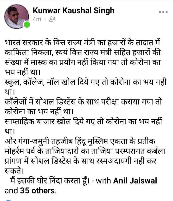 भारत सरकार के वित्त राज्य मंत्री का हजारों की तादात में काफिला निकला न उसमें किसी ने मास्क लगाया और ना ही किसी को कोरोनावायरस भय दिखा, स्कूल, कॉलेज, माल खोल दिए गए तो कोरोना का खौफ सरकार को नहीं सताया, और अगर गंगा जमुनी ताजीब, हिंदू मुस्लिम एकता का प्रतीक मोहर्रम पर्व के ताजियादारो का ताजिया परंपरागत ढंग से कर्बला प्रांगण में सोशल डिस्टेंसिंग के साथ रस्म अदायगी करने की बारी आई तो सरकार को कोरोना का खौफ सता रहा है। सरकार के ऐसे दोहरी नीति का मैं कड़े शब्दों में निंदा करता हूं।
