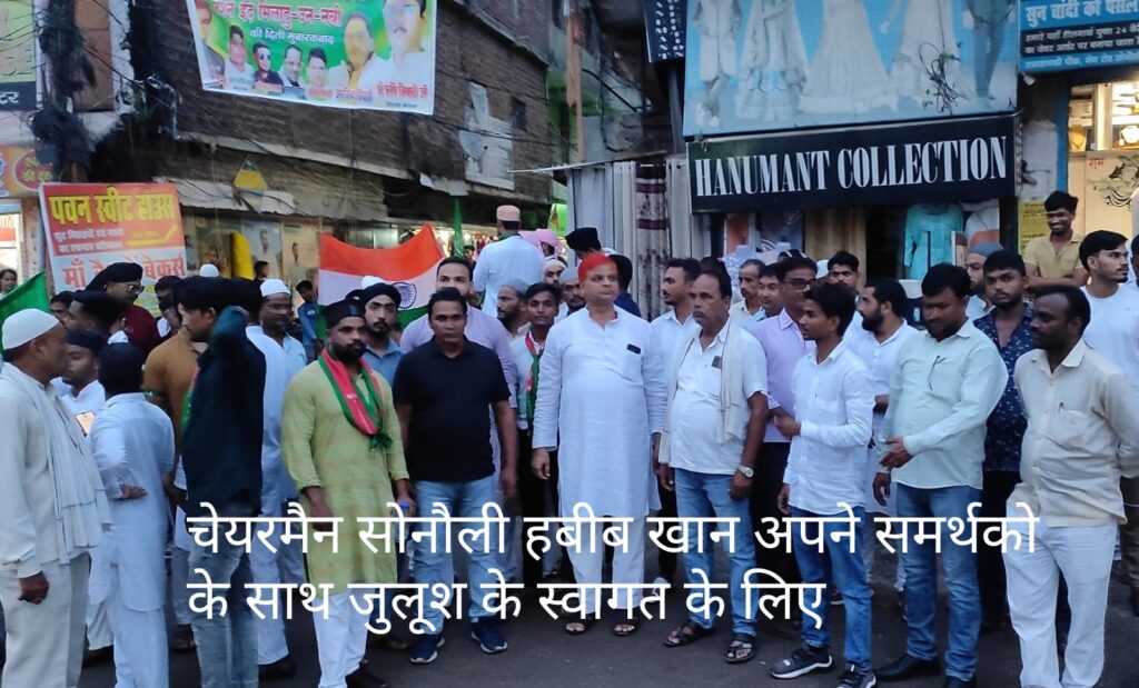 जुलूस में सबसे आगे मुस्लिम धर्मावलंबी जश्ने ईद मिलादुन्नबी मुबारकबाद और कौम के झंडे लहराते चल रहे थे। मुख्य मार्ग पर नगर पंचायत सोनौली हबीब खान द्वारा कस्बे के श्रीराम जानकी चौराहे पर स्टॉल लगाकर जुलूस में चल रहे सभी हजरात को मिठाई खिलाकर जल पिलाकर स्वागत किया। जुलूस में सोनौली नगर पंचायत के अध्यक्ष हबीब खान शामिल रहे। जबकि मस्जिद के मौलाना असगर साहब, की सरपरस्ती रही। जुलूस में मुख्य रूप से चेयरमैन प्रतिनिधि शाहनवाज खान, रानू आलम, अमीर आलम, सहित बड़ी संख्या में लोग मौजूद रहे।
