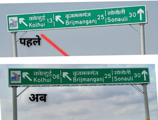 खबर का असर ,NHAI ने सुधार किया ललाइन पैसिया से कोल्होई की दूरी का साइन बोर्ड