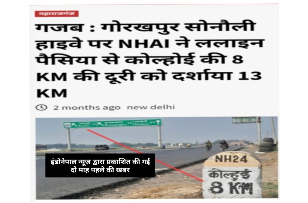 लगभग दो माह पहले इंडोनेपाल न्यूज ने एक खबर बड़ी ही प्रमुखता से प्रकाशित किया था । जिसका शीर्शक था ‘ गोरखपुर सोनौली हाइवे पर NHAI ने ललाइन पैसिया से कोल्होई की 8 K.M की दूरी को दर्शाया 13 K.M ‘ जिसका संज्ञान लेते हुए NHAI ने ललाइन पैसिया में लगे इस साइन बोर्ड में अब सुधार कर दिया है । पुराने साइन बोर्ड में ललाईन पैसिया से कोल्होई की दूरी को 13 किलोमीटर दर्शाया गया था । जबकी उसी साइन बोर्ड के बगल में ही लगे बहुत ही पुराने माइल स्टोन में ललाईन पैसिया से कोल्होई की दूरी को 8 किलोमीटर दर्शया गया है । जिसकी तस्वीर इंडोनेपाल न्यूज ने उजागर किया था । जिसके बाद जिम्मेदार अधिकारी हरकत में आये और अब इस साइन बोर्ड में सुधार कर के लालइन पैसिया से कोल्होई की दूरी को 6 किलोमीटर किया है । जबकि अभी भी उसी साइन बोर्ड के बगल में लगे माइल स्टोन पर कोल्होई की दूरी 8 किलोमीटर लिखा हुआ है । लेकिन यह माइल स्टोन काफी पुराने समय का है । और अब आबादी बढ़ने के हिसाब से कोल्होई का क्षेत्रफल भी बढ़ गया है । तो इसके अनुसार NHAI ने अब 6 किलोमीटर कर दिया है ।